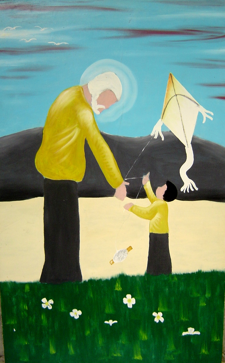 Este cuadro describe una historia de profundo amor, puro y sincero. un abuelo de 82 años a pedido de su nieto de 2 años le dio haciendo una cometa, y juntos se pusieron a hacerla volar llenando el al alma de todos que contemplamos la escena con amor.