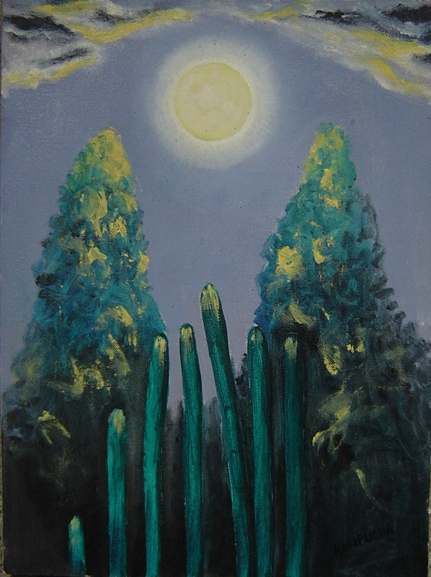 Es una planta que dio flores a los 20 años, y después murió, y que una noche de luna llena se me fijó esta imagen en la memoria.
